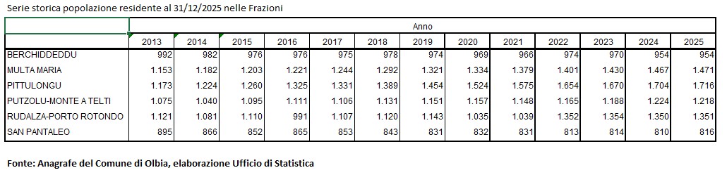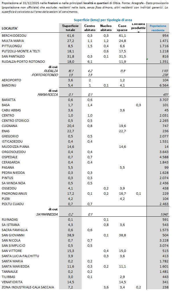 - Popolazione residente al 31/12 nelle frazioni e nelle principali località e quartieri di Olbia