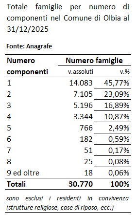 - Totale famiglie per numero di componenti nel Comune di Olbia al 31/12