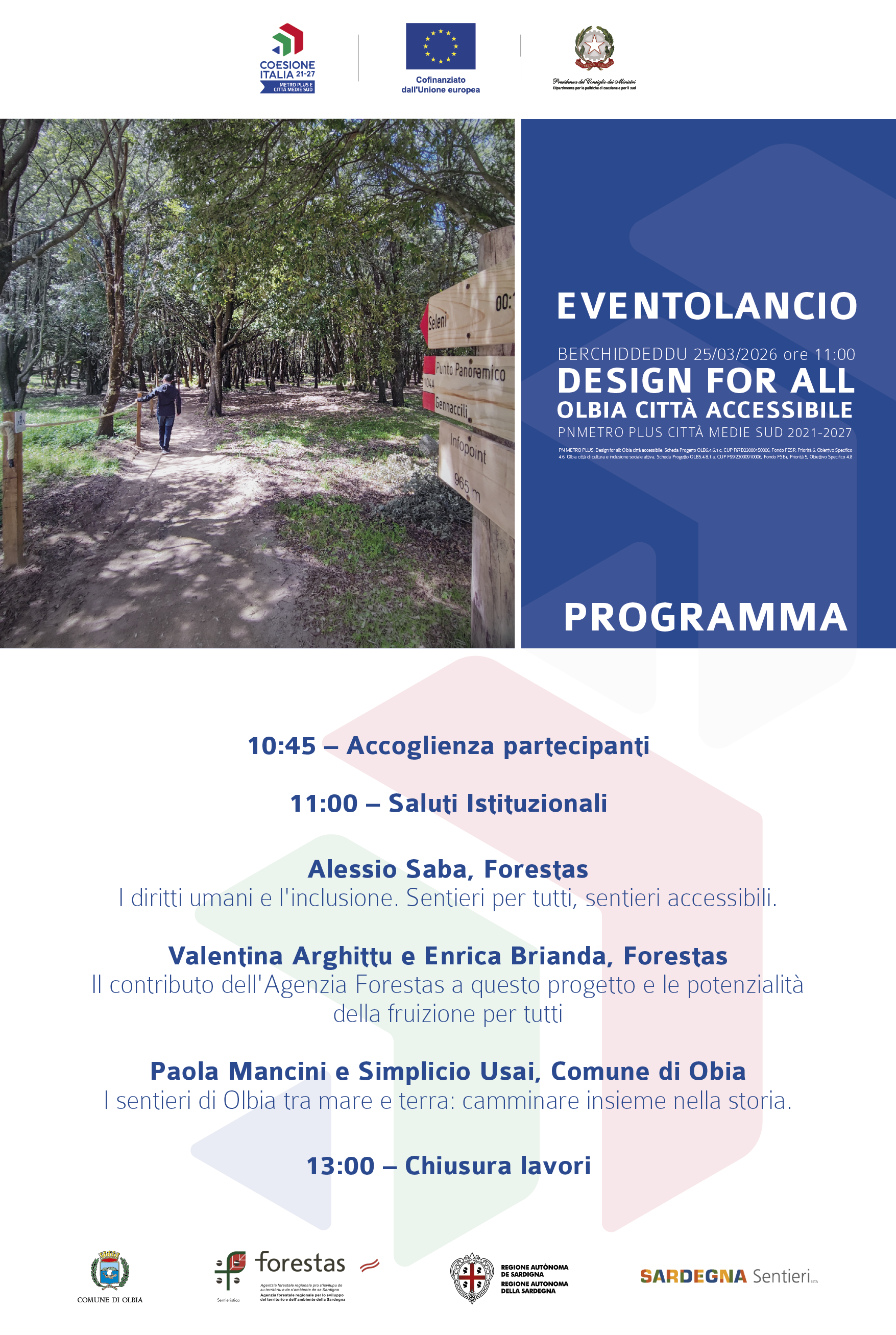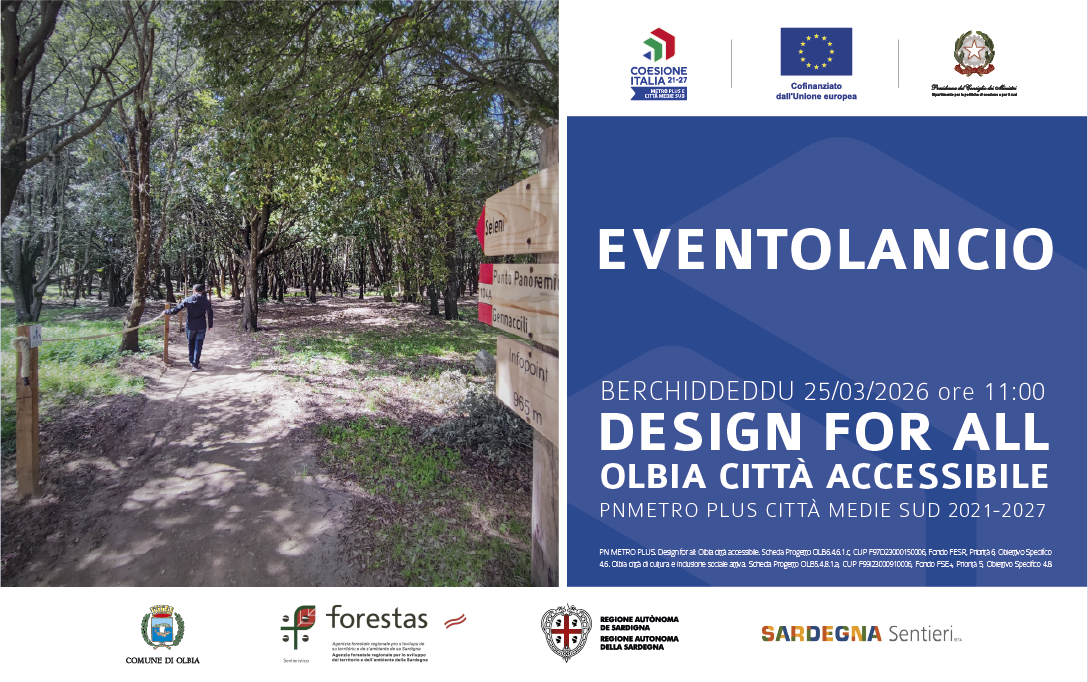 Il Progetto “DESIGN FOR ALL: OLBIA CITTÀ ACCESSIBILE” a valere sui fondi FESR 2021-2027, messo a punto dalla Città di Olbia assieme all’Agenzia Fo.Re.S.T.A.S. è la realizzazione di una rete sentieristica accessibile e fruibile per tutti, funzionale alla realizzazione delle azioni di partecipazione culturale, inclusione sociale e accesso alla fruizione dei beni naturali, paesaggistici, culturali e storici, rivolte all’intera Comunità di Olbia, con particolare attenzione alle persone con disabilità sensoriali, fisiche e cognitive.