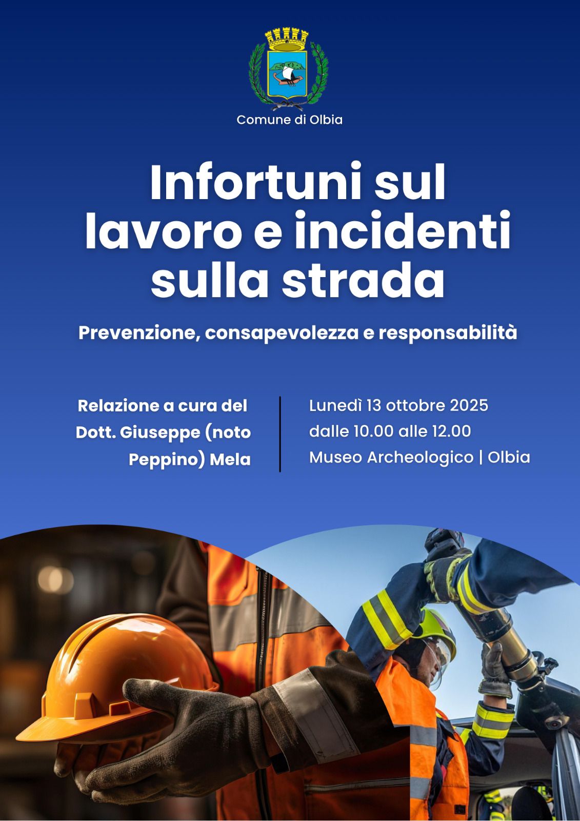 Il Comune di Olbia promuove un importante momento di formazione e sensibilizzazione aperto alla cittadinanza: l’incontro dal titolo “Infortuni sul lavoro e incidenti sulla strada”, che si terrà lunedì 13 ottobre 2025 alle ore 10:00 presso il Museo Archeologico di Olbia.