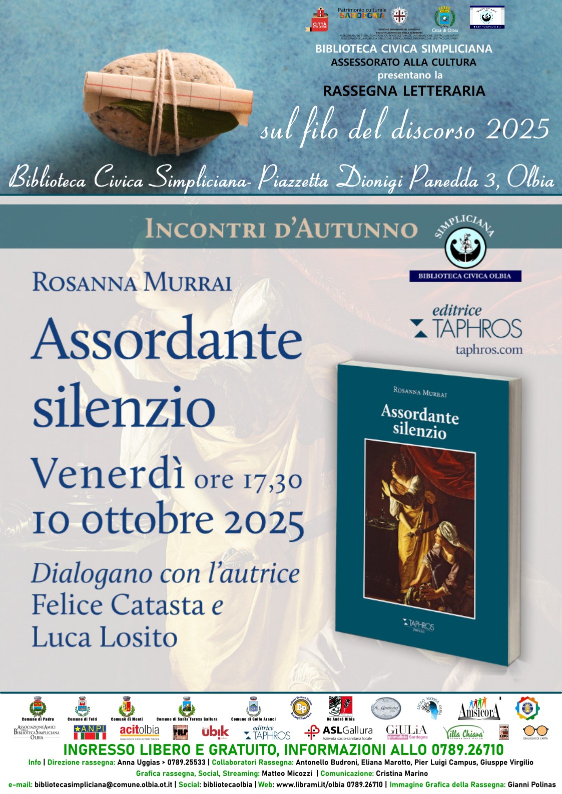 - Venerdì 10 ottobre 2025, ore 17:30 presentaizone del libro "Assordante silenzio" di Rosanna Murrai c/o la Biblioteca di Olbia;