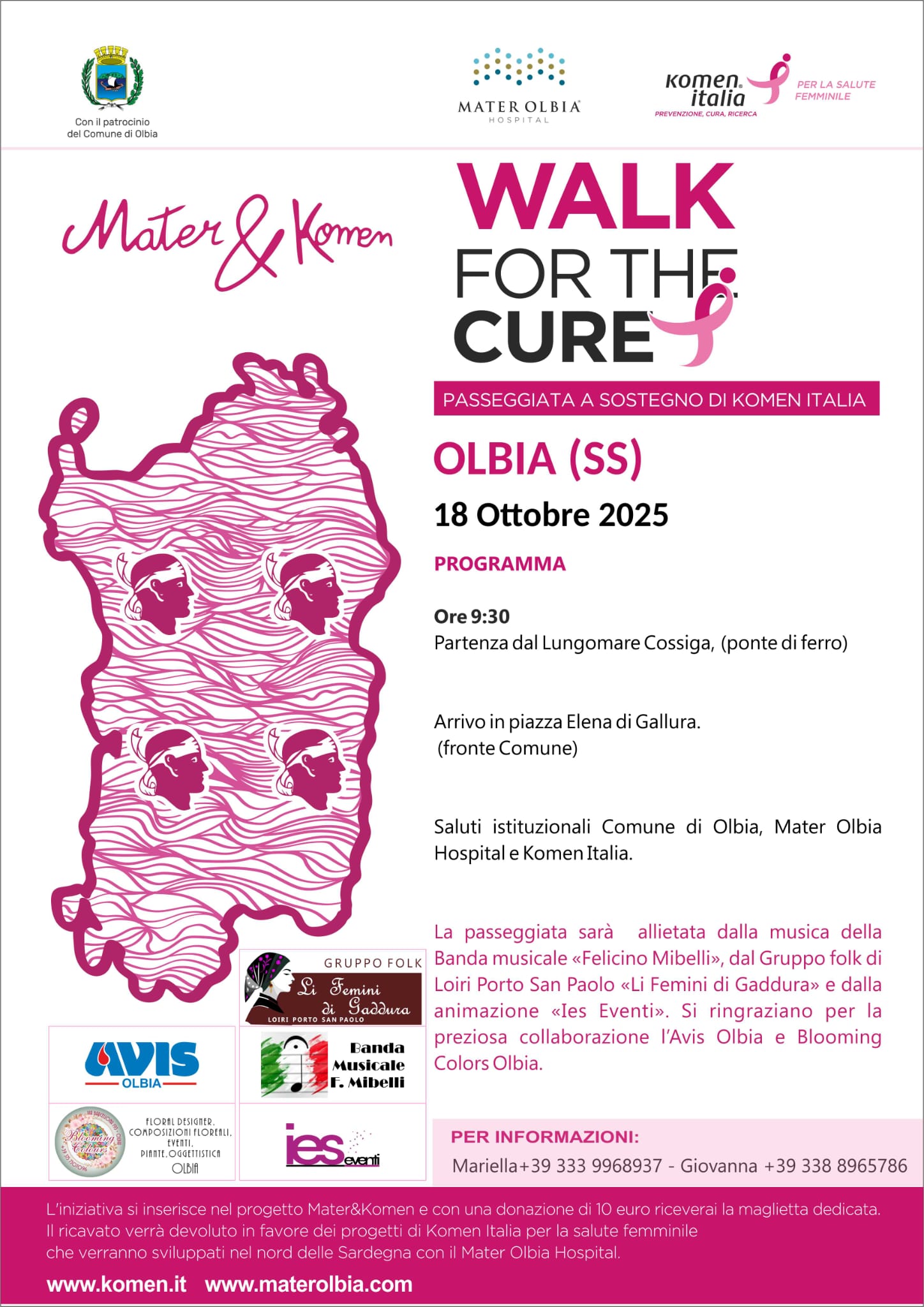 Torna ad Olbia, sabato 18 ottobre, l’attesa Walk For The Cure, la popolare passeggiata in rosa a sostegno deli progetti per la prevenzione della salute femminile, grazie alla consolidata partnership tra Mater Olbia Hospital e Komen Italia.